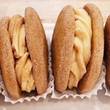 a charming autumn treat featuring soft, spiced cake rounds infused with the warm, tangy essence of apple cider. Sandwiched between the cakes is a luscious, caramel buttercream and apple compote filling with cinnamon, offering a delightful blend of apple and spice in every bite. (Fall Seasonal)