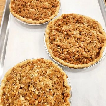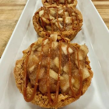 Featuring a delectable apple crisp topping. This mini pie boasts a classic apple filling, with tender, spiced apples baked to perfection. Topped with a golden, buttery crisp layer of oats, brown sugar, and cinnamon, it adds a delightful crunch and rich flavor contrast. All this is nestled in a traditional, flaky pie crust that provides a perfect base for the sweet and spiced apple filling. (Fall Season)