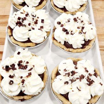a rich and indulgent dessert featuring a smooth, velvety chocolate custard filling nestled in a crisp, buttery pie crust. Topped with a generous layer of freshly whipped cream and garnished with chocolate shavings or curls, it offers a decadent blend of creamy chocolate and airy sweetness with each satisfying bite (Available for Special Order; and during Holiday's)