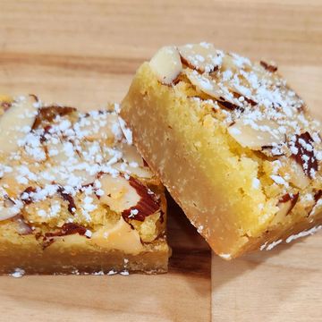 a delectable, buttery, and chewy bar with a rich almond flavor. It features a luxurious almond croissant-like topping and crispy almonds scattered throughout, creating a delightful texture contrast and nutty depth. This treat is a must-try for its irresistible blend of sweetness and almond goodness. (Summer Seasonal)