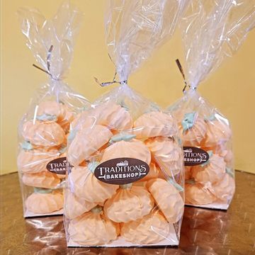 A pumpkin-shaped meringue dessert is a whimsical and delightful treat, perfect for autumn or Halloween celebrations. The meringue itself is light, airy, and crisp, with a melt-in-your-mouth texture. Its exterior is a soft golden-brown, achieved through gentle baking, while the inside remains delicate and slightly chewy, offering a satisfying contrast.
