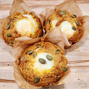 A pumpkin muffin with cream cheese filling is a cozy fall treat, featuring a soft, spiced pumpkin crumb and a rich, tangy cream cheese center. Topped with crunchy roasted pepitas, it adds a delightful nutty flavor and texture, making it the perfect combination of sweet, creamy, and crunchy.
