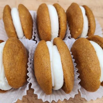 a delightful seasonal treat featuring two soft, spiced pumpkin cakes sandwiched around a velvety, cream cheese filling. The cakes are moist and flavorful, with hints of cinnamon, nutmeg, and clove, while the filling adds a smooth, sweet contrast, making each bite a perfect blend of pumpkin spice and indulgent creaminess.
