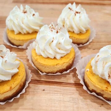 Bite-sized, creamy morsels featuring a smooth, spiced pumpkin cheesecake filling nestled in a graham cracker crust. Each one is a miniature indulgence, combining the rich, velvety texture of cheesecake with the warm, seasonal flavors of pumpkin and spice. (Fall Seasonal)