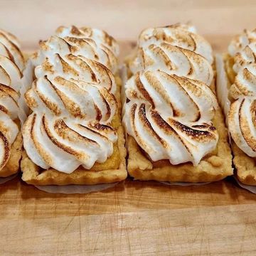 featuring a zesty lemon curd filling nestled in a buttery, crisp tart shell. The tart is crowned with a light, fluffy meringue that’s golden-brown on top, offering a perfect contrast between the tart, citrusy filling and the sweet, airy topping. The balance of tangy lemon and sweet meringue creates a refreshing, indulgent treat that’s both visually stunning and wonderfully satisfying.