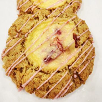 our strawberry cheesecake cookie combines the best of both worlds — soft, buttery cookie dough swirled with creamy cheesecake filling and bursts of real strawberry. Every bite delivers a rich, velvety sweetness that tastes like your favorite dessert in cookie form. (Summer Seasonal)