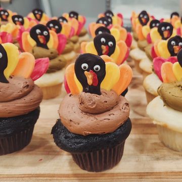 A cute and decorative turkey cupcake features a swirl of buttercream frosting in autumn colors, with colorful candy or icing feathers arranged in a fan shape. The turkey’s face is made with candy eyes, a red wattle, and a small beak, creating an adorable, festive treat for Thanksgiving.