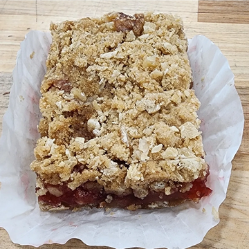 Gluten Free - a delightful dessert featuring a sweet-tart combination of ripe strawberries and tangy rhubarb, nestled in a buttery, crumbly crust. Topped with a light, golden crumble and baked to perfection, these squares offer a delicious balance of fruity flavors and a hint of tanginess, making them a refreshing treat for any occasion.