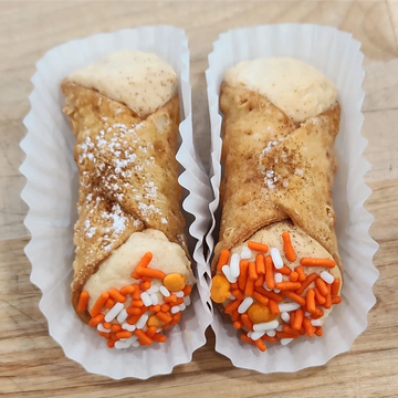 A pumpkin cannoli is a delightful twist on the classic Italian treat. It features a crisp, golden-brown cannoli shell with a delicate, flaky texture. The filling is a creamy blend of pumpkin puree and sweetened ricotta cheese, infused with warm fall spices like cinnamon, nutmeg, and cloves. The result is a rich, velvety filling reminiscent of pumpkin pie. To finish, the cannoli is adorned with fall-colored sprinkles and a light dusting of powdered sugar. (Fall Seasonal)