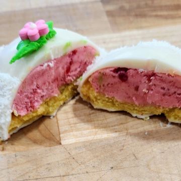a delectable treat featuring a zesty lemon cake encased in a light, raspberry buttercream mousse. This indulgent creation is then coated in a smooth layer of white chocolate and rolled in shredded coconut, offering a delightful combination of tangy lemon, sweet raspberry, and creamy coconut in every bite. (Discontinued)